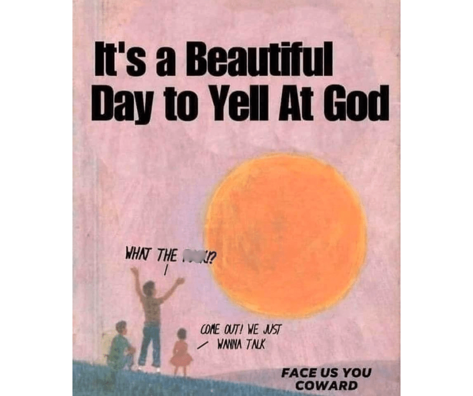 A friend of mine recently shared an image with me of an abstract scene in which three figures are shaking their fists at the sky and shouting expletives toward the sun. The caption read “It’s a Beautiful Day to Yell at God.” Among other phrases, one figure cries out “Face us you coward!” Another friend commented that Jesus actually did, in fact, face us. Jesus, God incarnate, came down to face the people who prayed fervently for a new world, a new regime, a new kind of justice. Not only did God respond by showing up among us, but God confronted us at our worst and loved us to death– his own death, with all the fear and violence and pain that came with it. This is not a god that is too fragile for our anger. This is not a god that is too proud for our disappointment. This is not a god that takes offense, not even when the things we hurl at him are too crass for the pulpit or the pew.